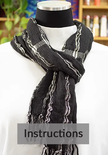 The incredible sparkle of Abigail Gimp really shines in this classically elegant scarf. Set against a background of Black mercerized cotton yarn with bands of Elastic Silk yarn, the Silver Abigail Gimp Yarn really shines.