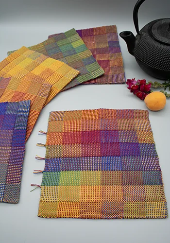 These Hearty Hemp Hot Pads will add a pop of color in any décor and protect your fingers too. Watch the parade of colors unfold! Experience Jennifer Moore’s unique system of Double Rainbow Doubleweave as you make 6 stunning hot pads. Choose 4 or 8-shaft instructions.