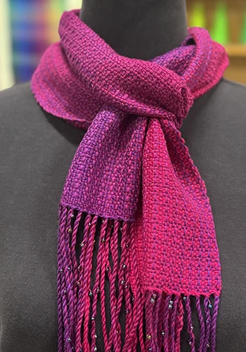 The kit contains enough yarn for two scarves, with finished dimensions of approximately 7″x 58″. The instructions include directions for both a plain weave scarf and a 3/1 lace patterned scarf. Instructions are written for both rigid heddle looms and 4 shaft looms.