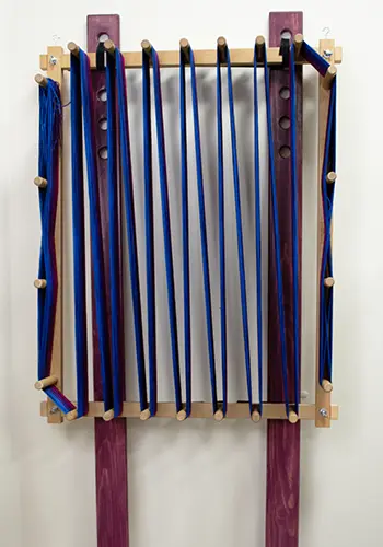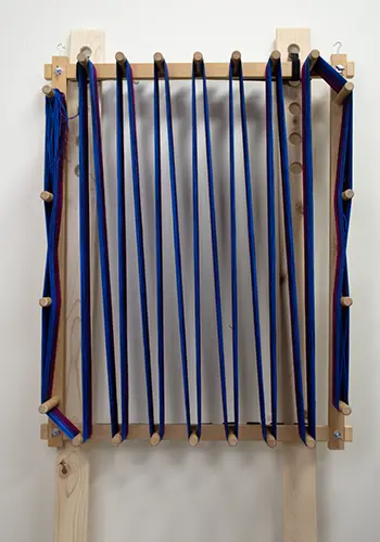 These pine poles are 6 feet long, 3.5″ wide and 1″ deep. Holes are spaced at the top to allow you to hang your warping board at a comfortable height.